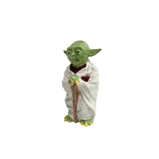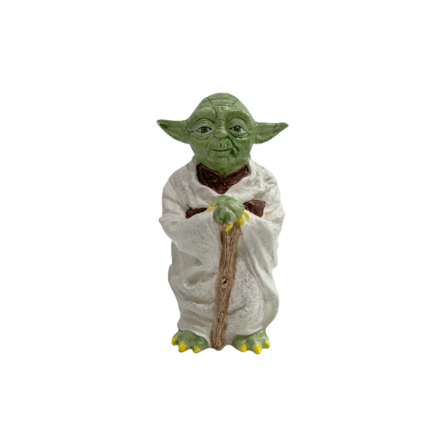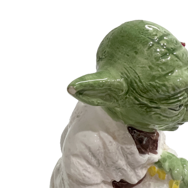 1983年代に発売されたSIGMA社製のセラミック・バンクです。SIGMAシリーズの貯金箱はチューバッカ、ジャバ・ザ・ハット、そしてこのヨーダの3バージョンがありますが、ヨーダのスタチュー・フィギュアの屈指のボリュームで存在感大!それもそのはず、ヨーダの象徴と言える小柄の再現が上手くいかず小顔で長身という謎のカスタムが効いた一品に仕上がっております。マスターがいつもより色男に見える貴重なスタチュー。本国アメリカでもSIGMA製陶器が遂にレア化&高騰しており今後の入荷はかなり難しくなると思います。底蓋あり。右耳の先のペイントが剥がれています。