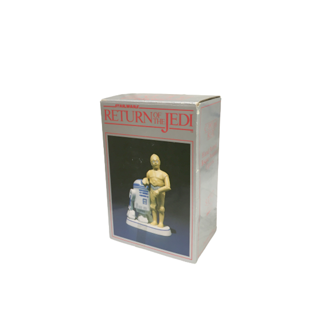 1983年に発売されたSIGMA社製のセラミック・フィギュアです。こちらは『ジェダイの帰還』シリーズからお馴染みの名コンビ。ハンドペイントによるクリーミーな配色とセラミックの質感が独特のユルさを醸し出しています。ずっと見てられる系スタチュー。タグあり箱付き。箱にはシールの剥がれた跡や傷などあります。