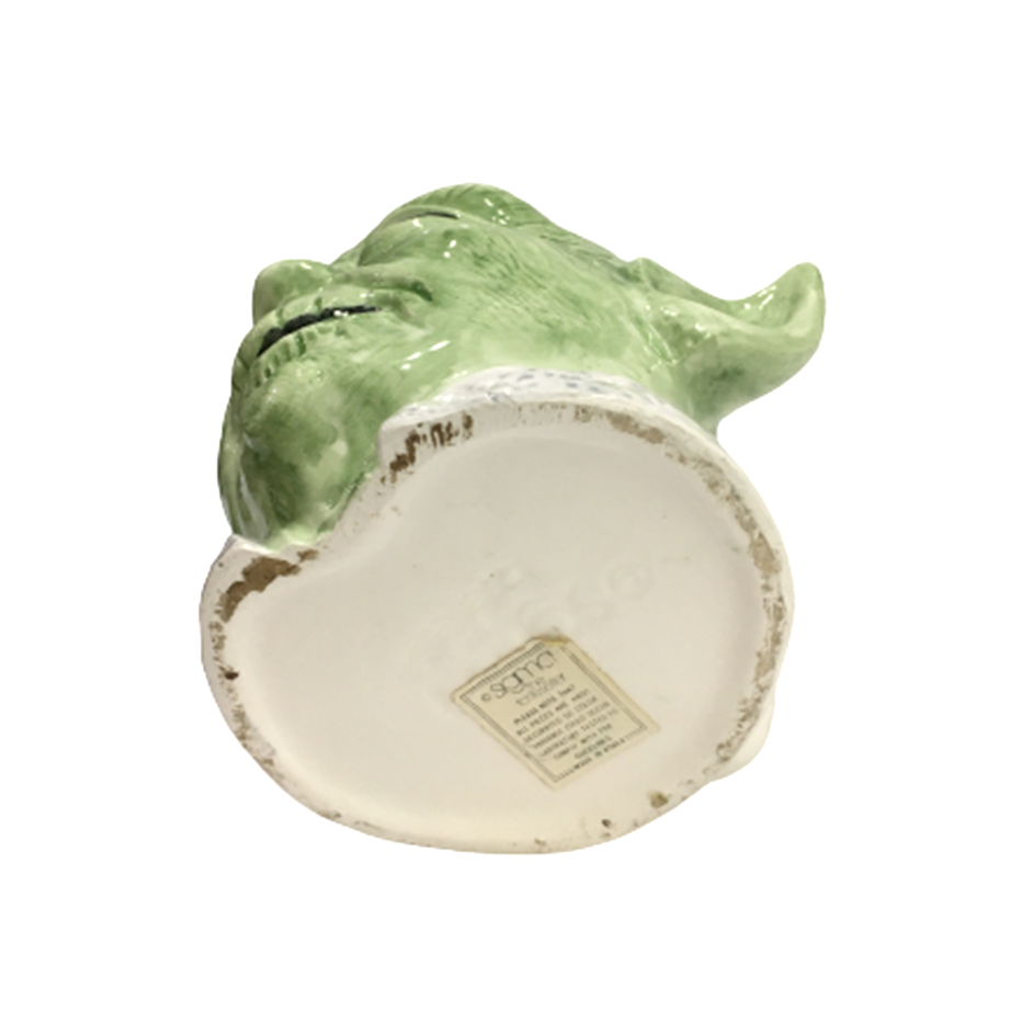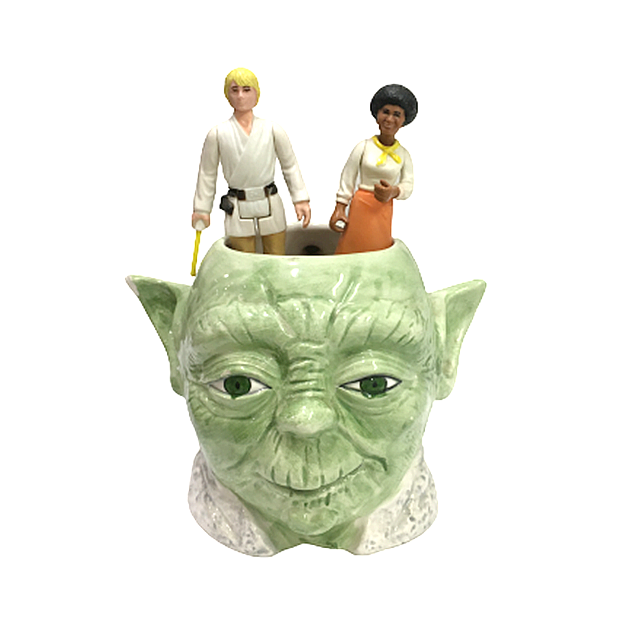 1980年代に発売されたSIGMA社製のセラミック・マグカップです。こちらは『帝国の逆襲』シリーズから、マスター・ヨーダの顔を象ったありがたーいマグ・カップになります。マスターの頭頂部からフォースを浴びるようなイメージでコーヒーをガブガブ飲むも良し、玄関に飾って家族を見守ってもらうも良しです。右耳の先に欠けている部分があります。