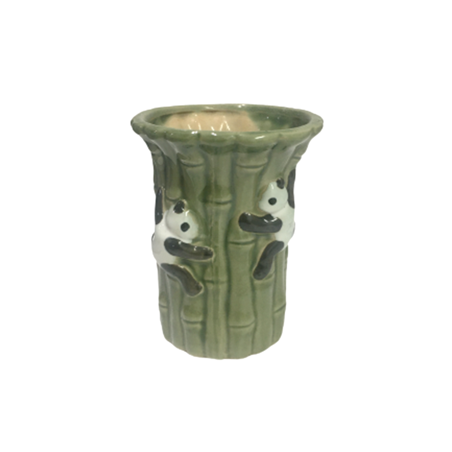 竹に2匹のパンダがぶら下がっている陶器製プランターになります。発色の良いバンブー・グリーンにパンダ・カラーが冴えまくり、陶器の温かさを経由したことで奇跡の仕上がりに!何を植えてもパンダが見守ってくれます。