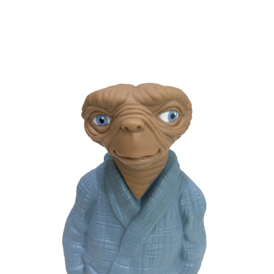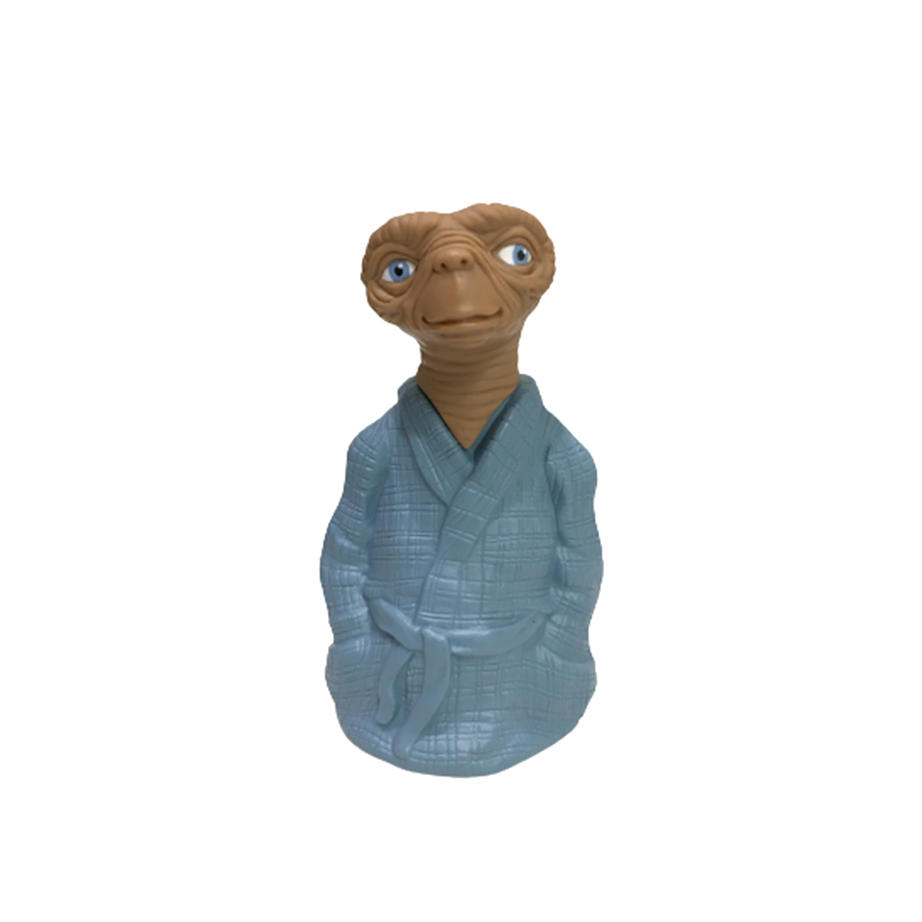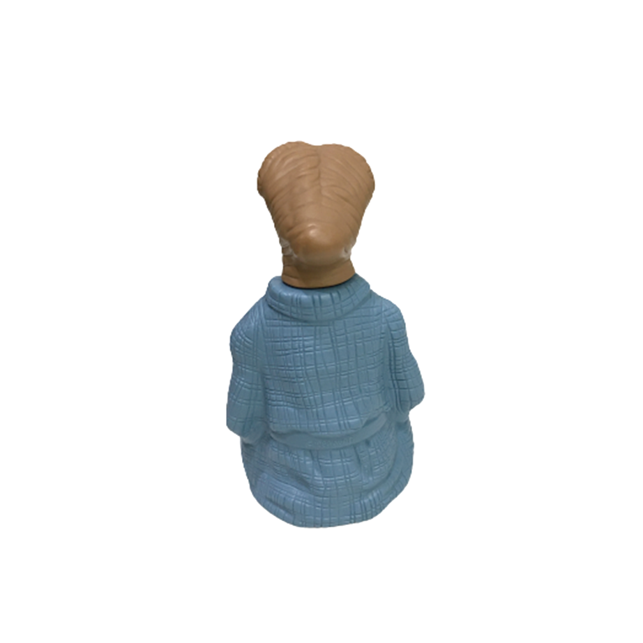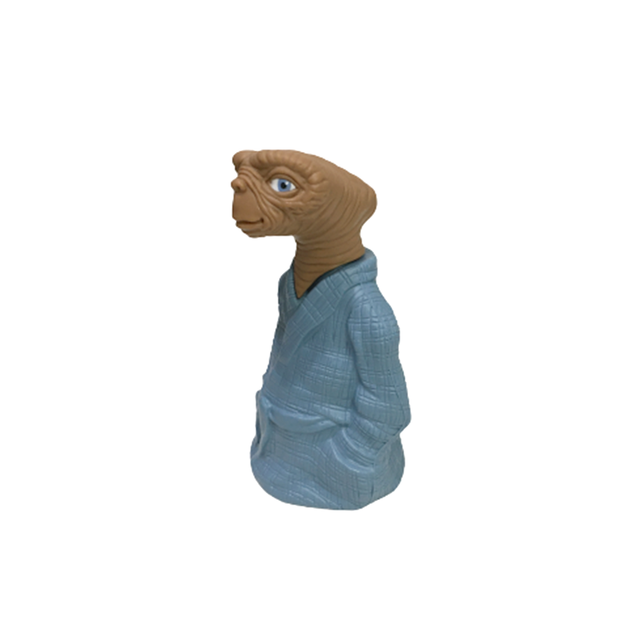 AVON社より1983年に発売されたE.T.のプラスチック製シャンプーボトルになります。なんと言ってもガウン姿と相まって表情がE.T.史上最も男前に仕上がったこちら!「先にシャワー浴びてこいよ」系のお洒落ダンディ・シティ・ポップE.T.として今の時代に激フィットしてきましたよ!ハードプラスティック製なので、ソフビ的で程よいサイズのスタチュー・フィギュアとしても最高です。箱付きの綺麗な状態です。箱にはシャンプーの液垂れによるウォーター・ダメージと、凹みや剥がれなどあります。