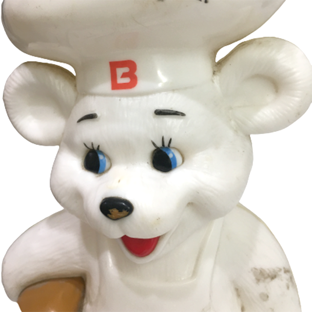 メキシコのパンメーカー"BIMBO BREAD"のマスコット・キャラクターOSITO BIMBOことビンボちゃんのプラスティック・バンクになります。こちらはソフビより遥かにサイズアップした10インチ・サイズ!米企業物と並べてもかなり大きくて迫力あります!ボディにかなり汚れがあるため特価です!ベタつきなどは無いので安心して下さい〜。底蓋も欠品しています。