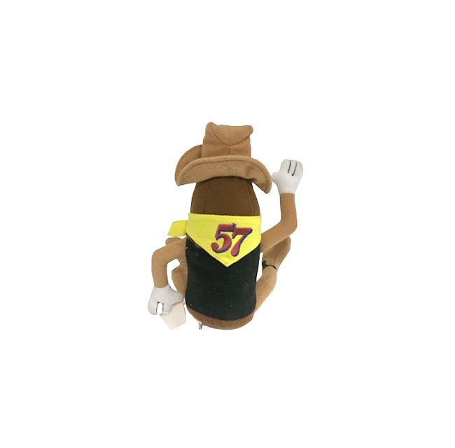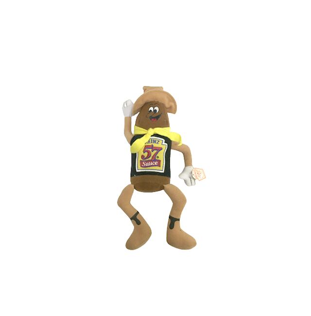 逆さボトルなど米国では大幅なシェアを占めるハインツのトマト・ケチャップですが、何を言いますか!ミートローフなんかのビンテージ・レシピには独自ブレンドの57ソースが欠かせませんよ!というわけで伝統のハインツ57ソースもキャラクター化していました!アンパンマンにも出てきそうな鼻高のっぽキャラですが、オールドアメリカン風味のウエスタン・スタイルに擬人化!長年愛されたソースが笑っているようです。今晩の夕食はぬいぐるみを抱きながらミートローフで決まりですね。最高です。タグ付きの綺麗な状態です。