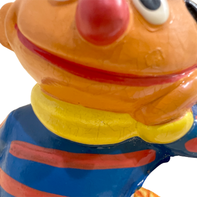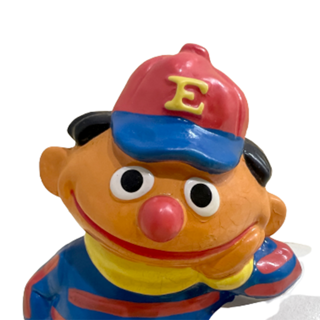 セサミ・ストリートの象徴アーニーのセラミック製コイン・バンクになります。セラミック製オブジェという設計上のユルくて丸味を帯びたムード感が、アメリカン・べースボール設定を通して、1978年というオールド・セサミ・ストリートの世界観と奇跡的に結びついた最高の貯金箱となります。アーニーのカラーリングを活かしながら陶器としてディフォルメされたレトロ70'Sのスーヴェニア感、ボーダーの着色の甘さ、キャップの小ささ、ボールのデカさとセサミ・ストリート・ロゴの入り方などかなりのゼツいバランス!数あるアーニー陶器の中でも屈指のおすすめアイテム。ようやく入荷しました。ゴム製の底蓋もあります。