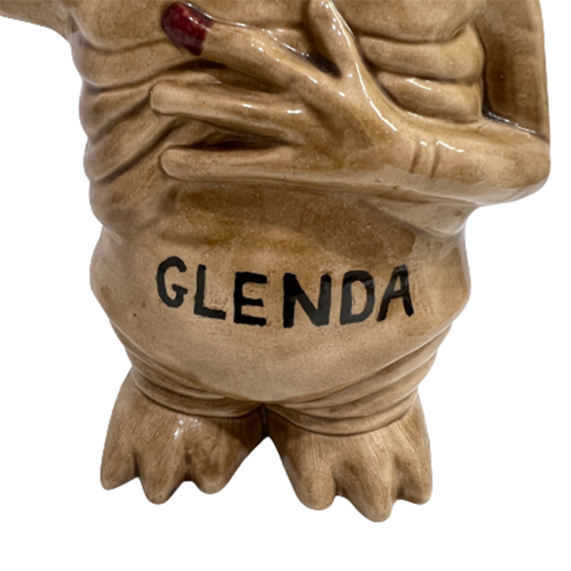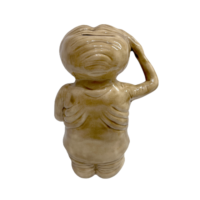 80年代製のセラミック・バンク。DIYハンドメイドなのでカラーリングはじめ無数のパターンが存在しますが、まさかのE.T.の目をくり抜いたバージョンを発見してしまいました。更に、スタンダード・ベージュ・カラーに指先も基本のレッド・カラーですが、胸元にババーンと本人なのか贈り物としての相手なのかのネームが入っているところもインディー・パンク精神を感じずにはいられません。インディー・ポップ・イーティー・パンク・バンク!頭部にはコイン投入口。コイン取り出し口のゴムのキャップ初めから無いタイプになります。