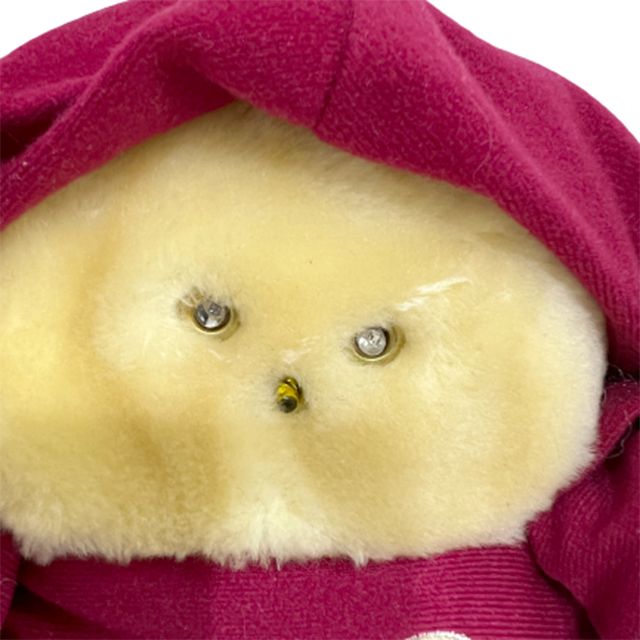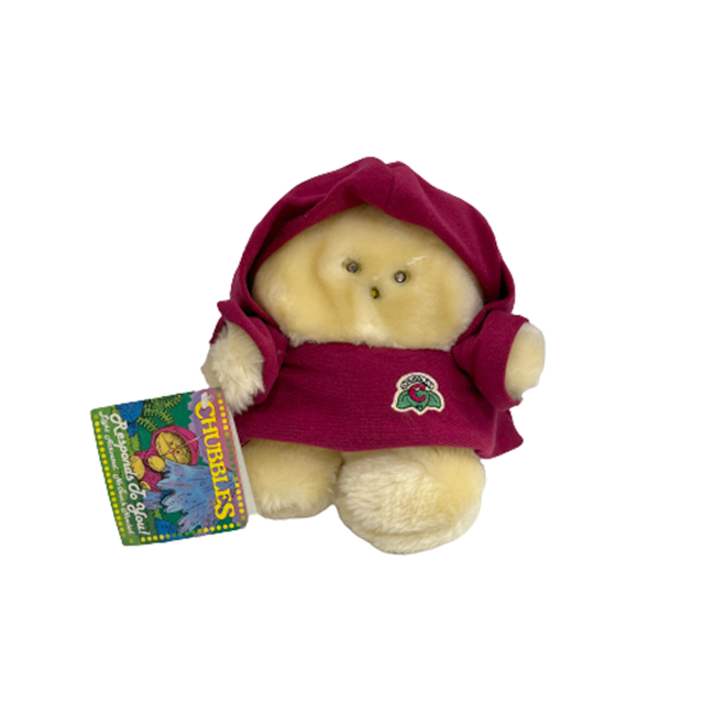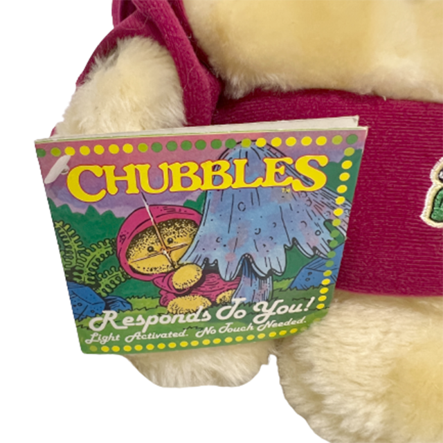 80'S アメリカン・トイの良心ことAnimal Fair社の大ヒット商品"Chubbles"のぬいぐるみになります。リンクの当時のCMを見てもらえばわかるように、ファービーよりも早かった、サウンドとフラッシュで応えてくれるコミュニケーション・プラッシュ・ドール!チャブルスのパッチ付きマルーン・バージョンになります。ジェダイを彷彿とさせるフード付きコートにイウォークのようなモコモコ毛むくじゃらボディ、ライトとして発光するつぶらな瞳と鼻にまんまると丸いフォルムで80'Sど真ん中&最&高となります!お尻の画像の可愛いこと!タグ付き。背中の電池コードは健在ですが動作未確認です。