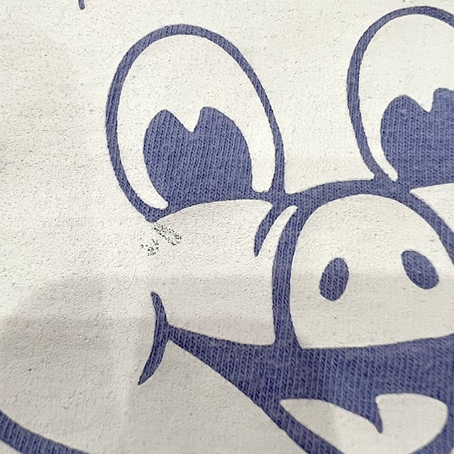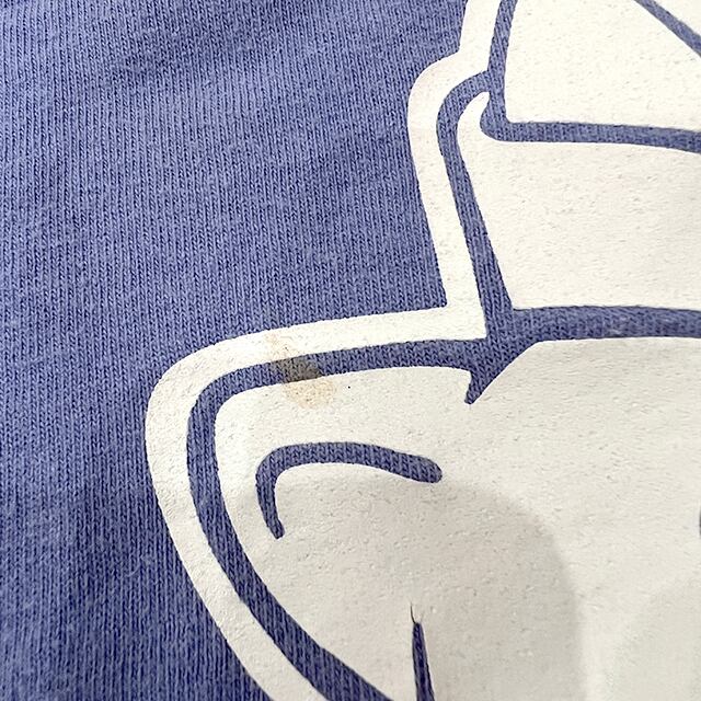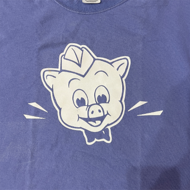 アメリカのスーパーマーケット・チェーン「ピグリー・ウィグリー」からマスコット・キャラクター、Mr Pigがフロントにドーンと入ったTシャツになります。。世界初のセルフサービス(入り口で自らカゴを取り、商品も自分で入れてレジで支払い、袋にも自分で入れる)を実施したり、ショッピングカートやPOSシステムを初めて導入した元祖スーパーマケット。ブタ・ロゴが方々まで最高ながら、90'Sムードを内容したグラフィック・デザイン、ほどよくビンテージ化したGILDANボディにライト・ブルーから絶妙にライト・パープルが織り混ざったカラーリングまで、夏を取り戻すのに最高となります。