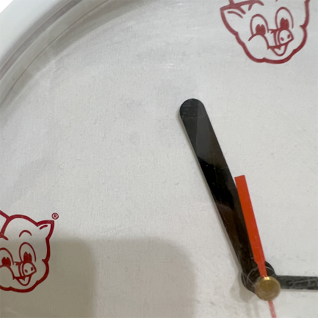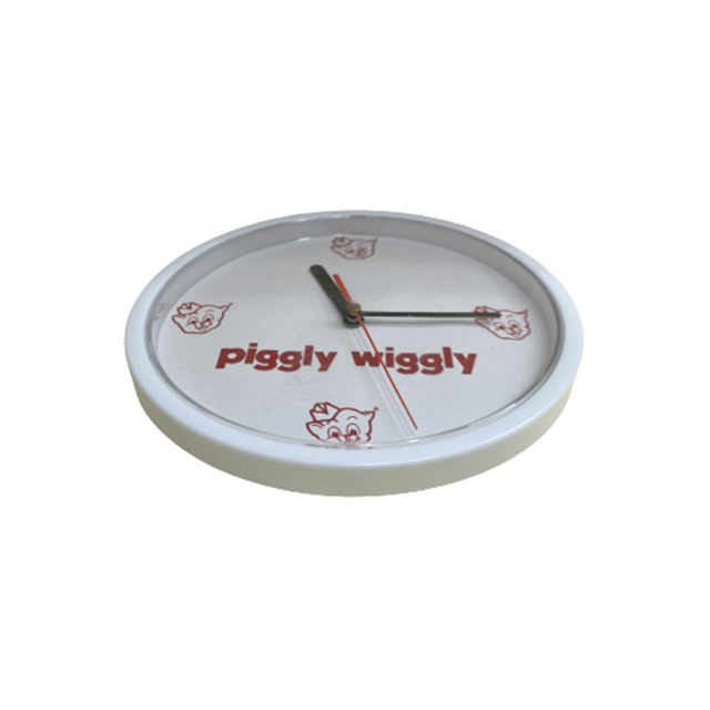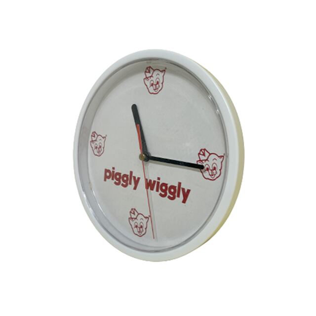 アメリカのスーパーマーケット・チェーン「ピグリー・ウィグリー」からマスコット・キャラクター、Mr Pigのロゴが入ったオフィシャルのビンテージ壁掛け時計になります。世界初のセルフサービス(入り口で自らカゴを取り、商品も自分で入れてレジで支払い、袋にも自分で入れる)を実施したり、ショッピングカートやPOSシステムを初めて導入した元祖スーパーマケット。店頭ディスプレイ・タイプは市場でもよく見ますが家庭用プラスチック製コンパクトサイズはかなりの珍品。シンプルなロゴと丸いフォルムで文句無し。動作も確認済みです。外箱付き
