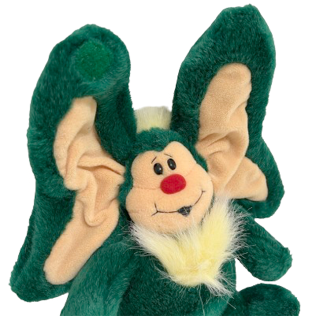 読み聞かせカセット・テープ付きで1994年に"Mary Meyer"より発売された、森の小妖精ウォンプキーのぬいぐるみになります。イウォーク族のように森に生息、世界中の生き物とコミュケーションができると言う設定でもう大満足。更にバタフライ・イヤーと呼ばれる大きな耳が特徴で、森=のグリーン・ボディに赤鼻というMUZZY&トナカイ的なホーリー・ムードまで完璧な90'Sマイナー・クラシック・アイテムです。蝶耳にはマジックテープが付いており実際に顔を包み込めます。胸元と頭の毛や困り気味の眉も最高。2000年代にCGで映画化されていますが、当店は断然オリジナル絵本派。MUZZY、イウォークに続く全毛キャラとなります。