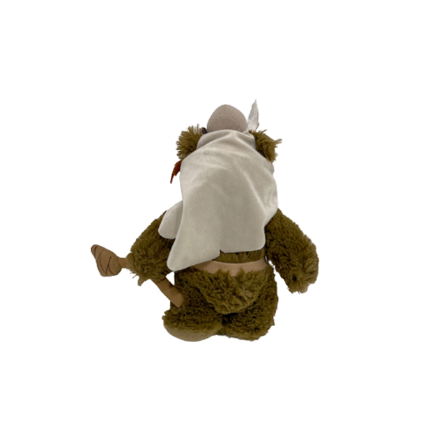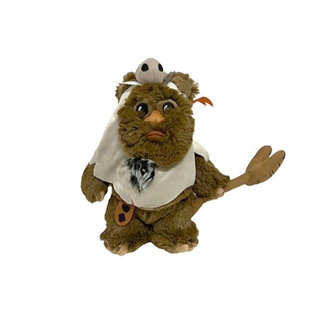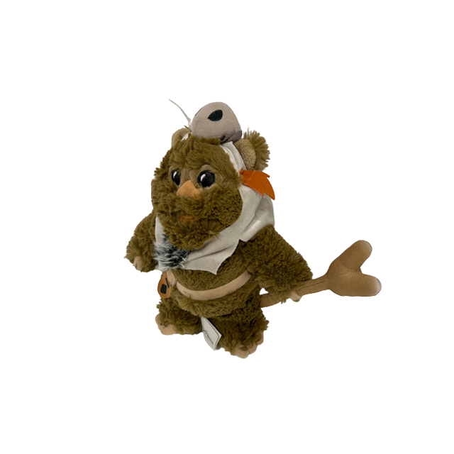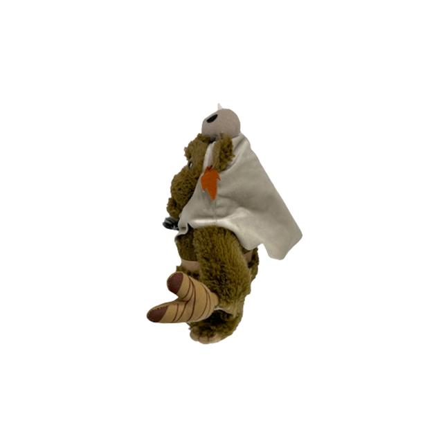 ディズニー・パーク限定のイウォークぬいぐるみ・シリーズからこちらもマックスなレア・キャラ「パプルー」のぬいぐるみになります。デス・スターのシールド・バンカーでの戦いにて、作戦無視のフライングでスカウト・トゥルーパーからスピーダー・バイクを奪って逃げたあのイウォークがパプルーです。頭につけた小動物のガイコツや二股仕様の杖など細部のディティールにも拘りつつイウォーク最大のキュートな熊顔とマイクロファイバーの超気持ち良いモジャモジャボディに着地。過去最高のイウォークのぬいぐるみと言ってしまいます。爪の色は金色。