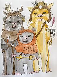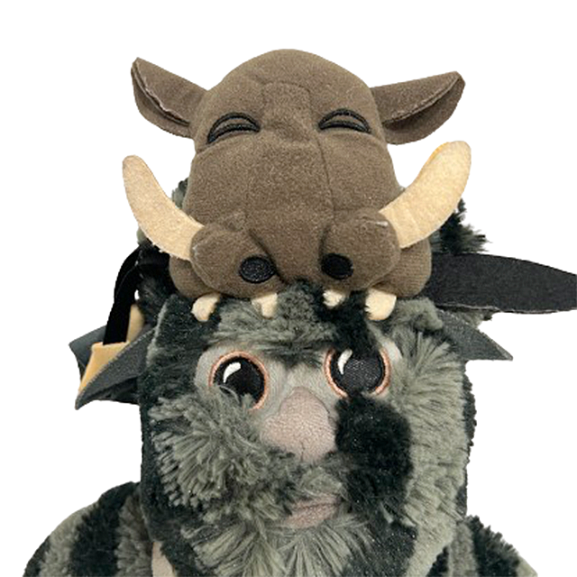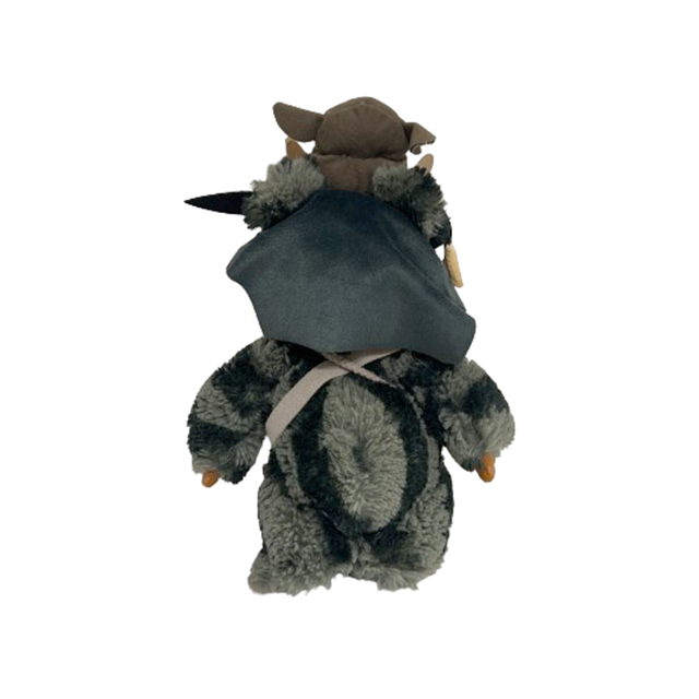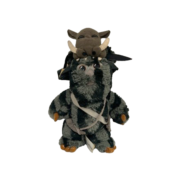 USA ディズニー・パーク限定のイウォークぬいぐるみ・シリーズから爆レア三銃士「ティーボ」のぬいぐるみになります。イウォーク族のシャーマンとして君臨、C-3POの翻訳によりイウォーク族をエンドアの戦いへと導いたのも彼なのです。グレーのストライプ模様がイウォーク族の中での存在感を示し、鋭い牙が生えたガーレックの頭被りで屈指の最高キャラとなります。反乱軍の勝利となったエンドアのラスト・シーンでトルーパーのヘルメットを太鼓代わりに叩いていたイウォークも彼なのです。もちろんマイクロファイバーの超気持ち良いモジャモジャボディ。こちらもネイルの色は金色です。