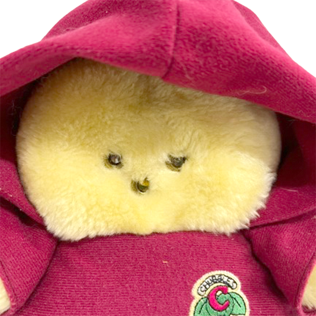 80'S アメリカン・トイの良心ことAnimal Fair社の大ヒット商品"Chubbles"のぬいぐるみになります。リンクの当時のCMを見てもらえばわかるように、ファービーよりも早かった、サウンドとフラッシュで応えてくれるコミュニケーション・プラッシュ・ドール!チャブルスのパッチ付きマルーン・バージョンになります。ジェダイを彷彿とさせるフード付きコートにイウォークのようなモコモコ毛むくじゃらボディ、ライトとして発光するつぶらな瞳と鼻にまんまると丸いフォルムで80'Sど真ん中&最&高となります!お尻の画像の可愛いこと!背中の電池コードは健在ですが動作未確認です。