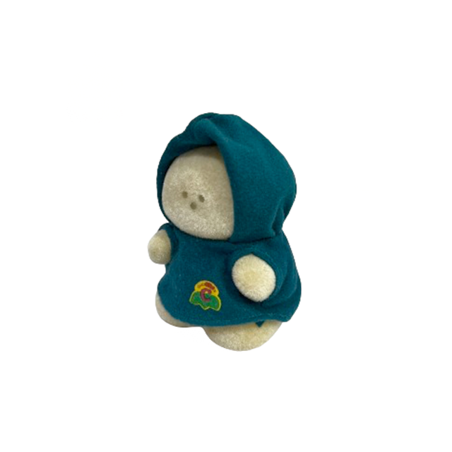 Animal Fair社の大ヒット商品"Chubbles"には85年に新たな展開がありました。こちらはホタルの森の奥深くにあるムーン・グロウという池に集まるチャブルスという設定のニュー・シリーズ"Moon Glow Chubbles"。単純に小さいチャブルスも最高。大きさは4インチ・サイズですが、同じく目と鼻がサウンドに反応して光り、フード付きコートを着用したフロックド・プラスティック製ドールとなります。多分あまり売れなかったため9インチ・サイズより全然レアとなります。電池ボックス確認済み。サウンドとライト共に通電しますが、動作の正確さは未確定です。