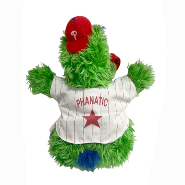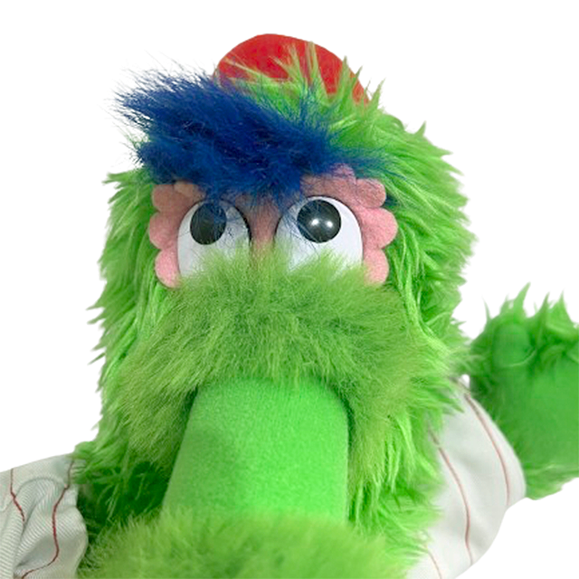 MLB "Philadelphia Phillies"の大人気マスコット「フィリー・ファナティック」のTwins Enterprise社製18インチ・ビッグ・サイズ・プラッシュ・ドール。78年にセサミ・ストリートと同じハリソン・エリクソン社がデザインを手掛けた完全ジム・ヘンソン親戚スタイルで既に最高となりますが、口がメガホンという点でヘンソン・キャラも超えてきました。ミラクルなバランスで保たれたカラーリングで動くポップアート化にも成功。ストライプのユニフォームはトドメと言えます。着脱可能なベーツボールシャツもヘヴィーウェイト仕様、チャームポイントの舌にはワイヤーも入る拘り、コットンもしっかり詰まった最高仕上がりとなります。