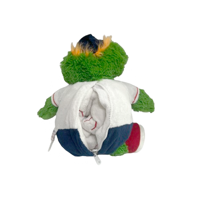 フィリー・ファナティックに続く特大プッシュ・マスコット、ボストン・レッドソックスの「ウォーリー・ザ・グリーンモンスター」!こちらはMLB公式グッズを展開する"Genuine Merchandise"が手掛けたレア・プラッシュ・ドール。そして恐らく最大級サイズ。ディフォルメも程良いジム・ヘンソン顔の周りに多めに盛られた最高のもじゃもじゃ仕上げ、ロゴ入りBBキャップも小振りなバッチリ対比。もちポリエステル・ファイバーの手触りが気持ち良しな丸くてぽってりボディも最高ですが、何と!背中のジッパーを開けてくるりと裏返せばレッドソックス・ロゴのボール・クッションになるトランスフォーマー仕様。一つで二度美味しいとはこのこととなります。